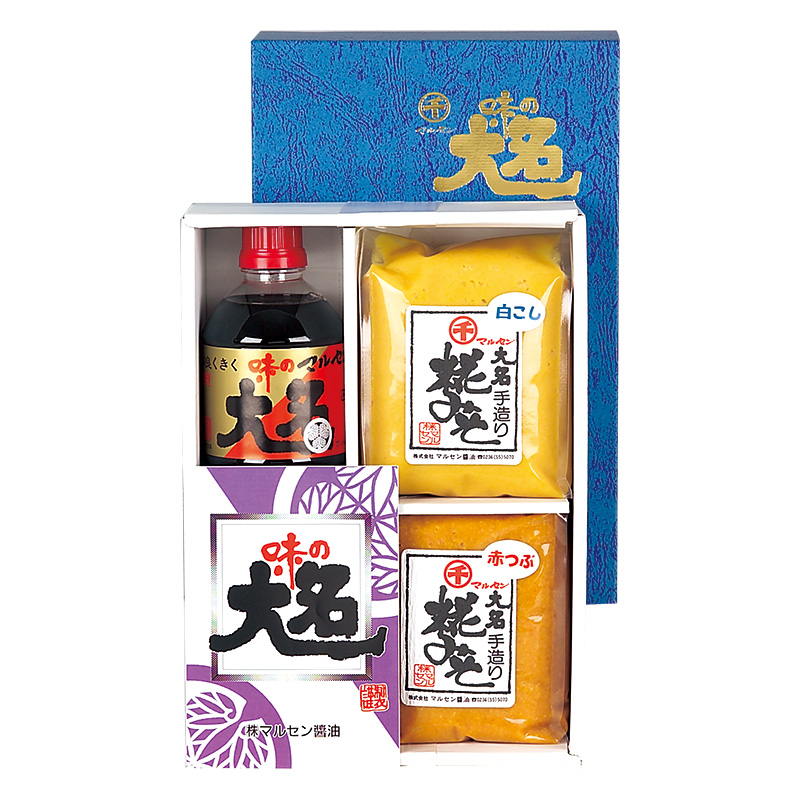 | 内容量 | 味の大名かつお 1,000ml×1本 白こし味噌 1kg×1個 赤つぶ味噌 1kg×1個 |
